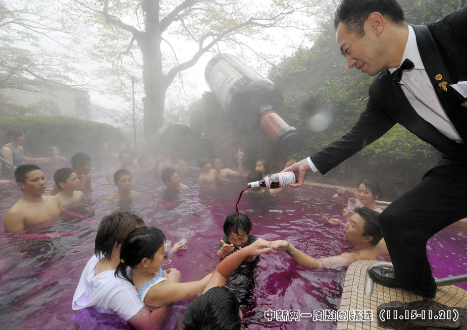 日本神奈川县箱根小涌园SPA会所从11月19日开始举行为期12天的户外美酒温泉浴。图片来源:中国新闻网>>点击观看详细内容