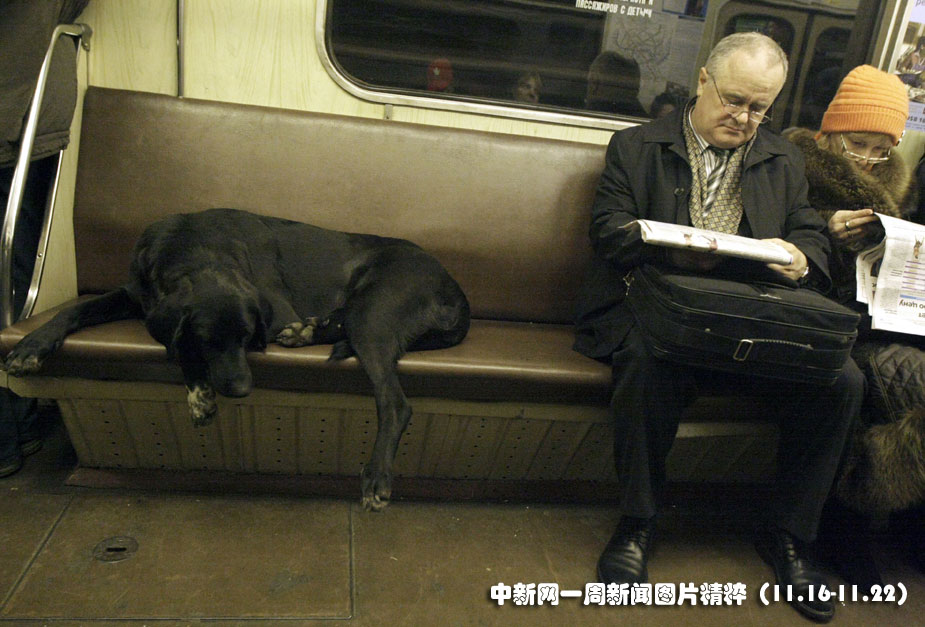 2009年11月18日,俄罗斯首都莫斯科的一只流浪狗与乘客同乘地铁。图片来源:中国新闻网