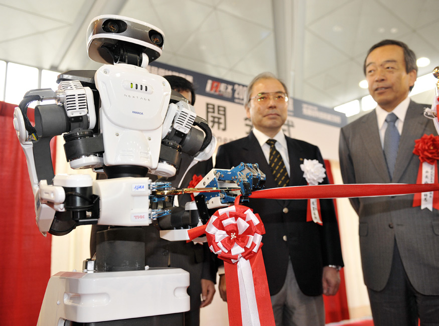 11月25日,日本东京举行了国际机器人大展,约200家企业和研究机构携机器人研发领域的最新成果参加本次为期4天的展览。图为最新研发的机器人Nextage与嘉宾共同剪彩。