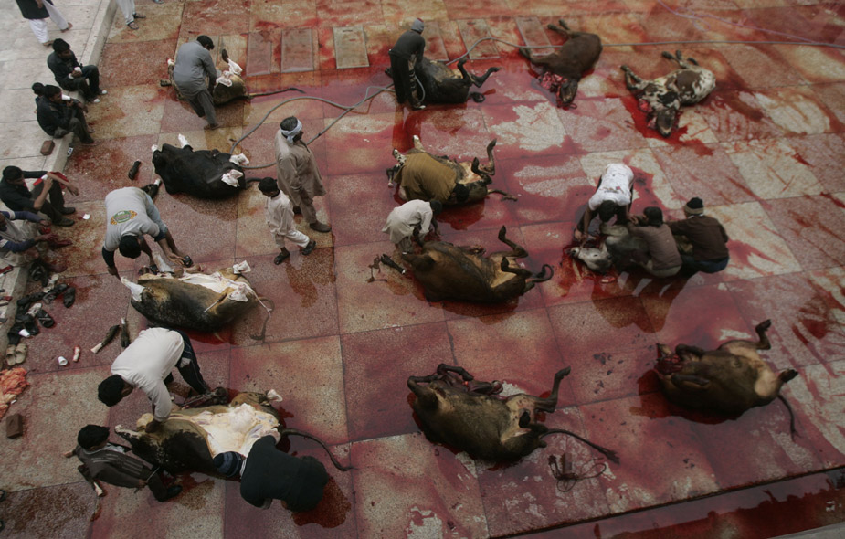 11月28日,世界各国的穆斯林迎来传统节日“宰牲节”。图为巴基斯坦的穆斯林在宰牲节上宰杀牲畜。