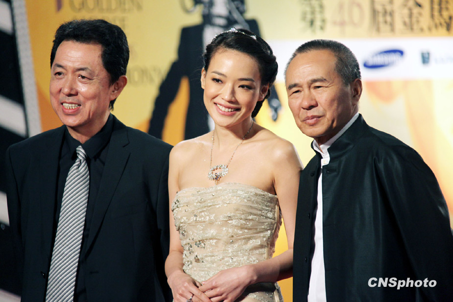 第46届台湾金马奖颁奖礼28日晚上在台北盛大举行。著名导演朱延平(左)、侯孝贤(右)和影星舒淇(中)联袂出席。中新社发 黄少华 摄