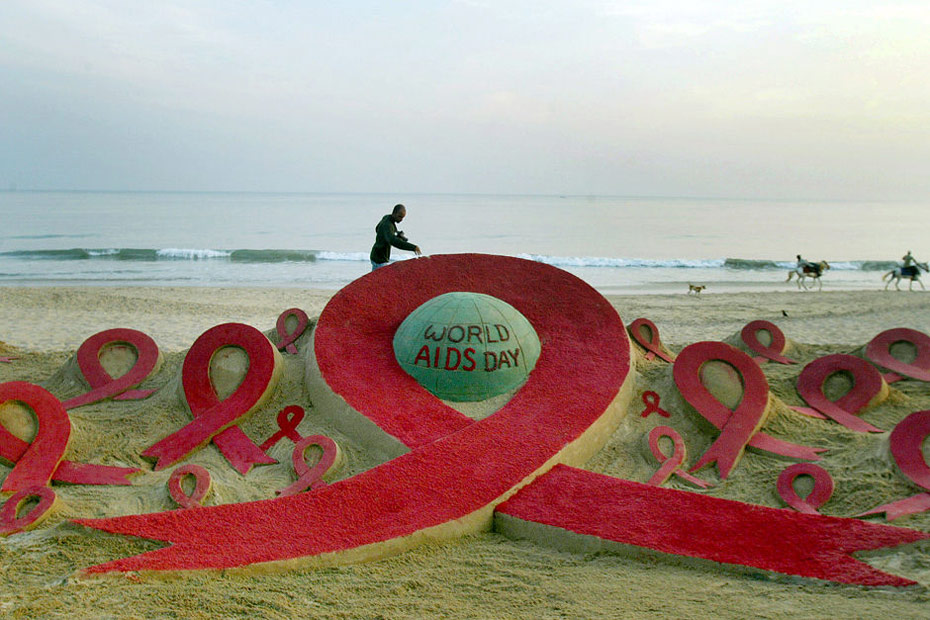 11月30日,印度邦布里,一名艺术家为世界艾滋病日在海滩上制作了红丝带主题沙雕。12月1日是世界艾滋病日,2009年世界艾滋病日的主题是“普遍可及和人权”。世界各地民众组织各种活动呼吁人们关注艾滋病。图片来源:中国新闻网