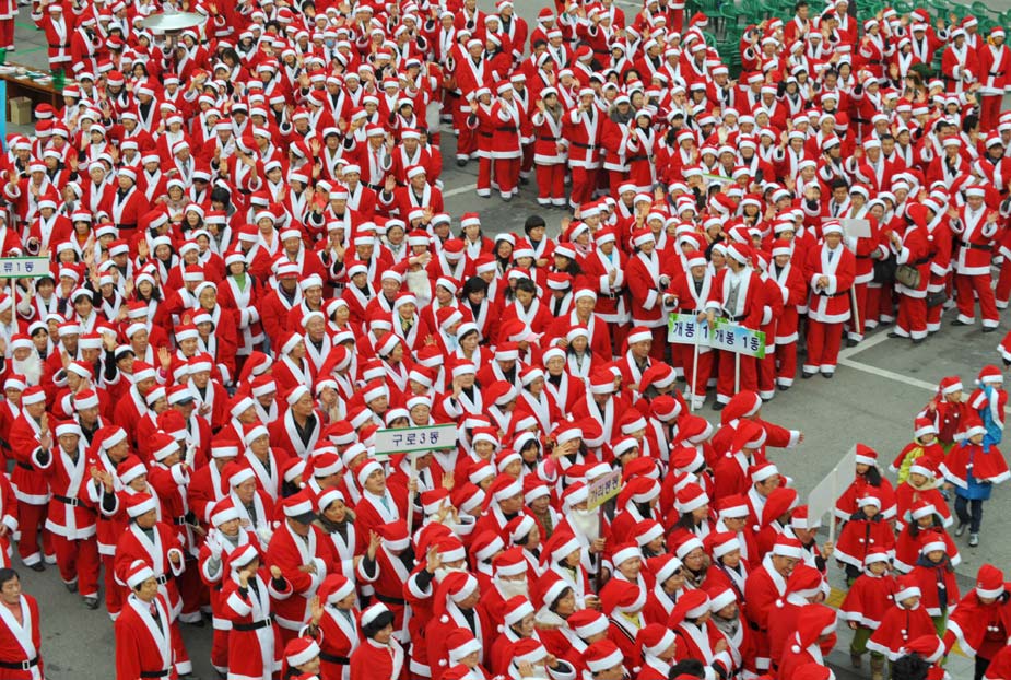 12月1日,韩国首都首尔市,一千多名“圣诞老人”举行游行为社会慈善项目筹款。图片来源:中国新闻网