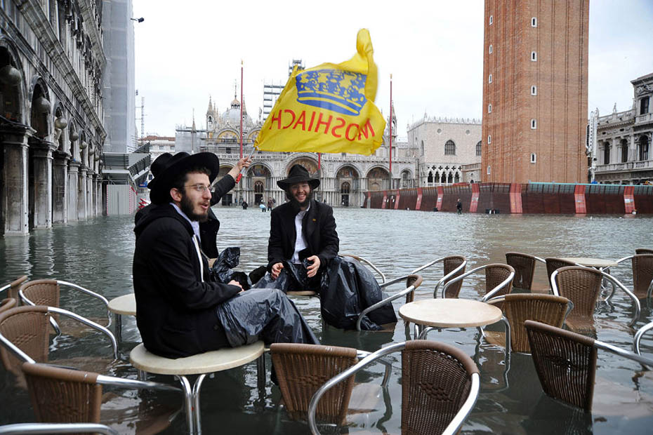 图为游客们坐在露天咖啡馆的桌子上,椅子已经被洪水淹没。