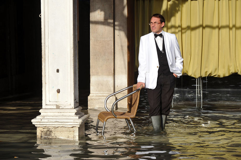 图为一名穿着雨靴的服务生站在圣马可广场上。