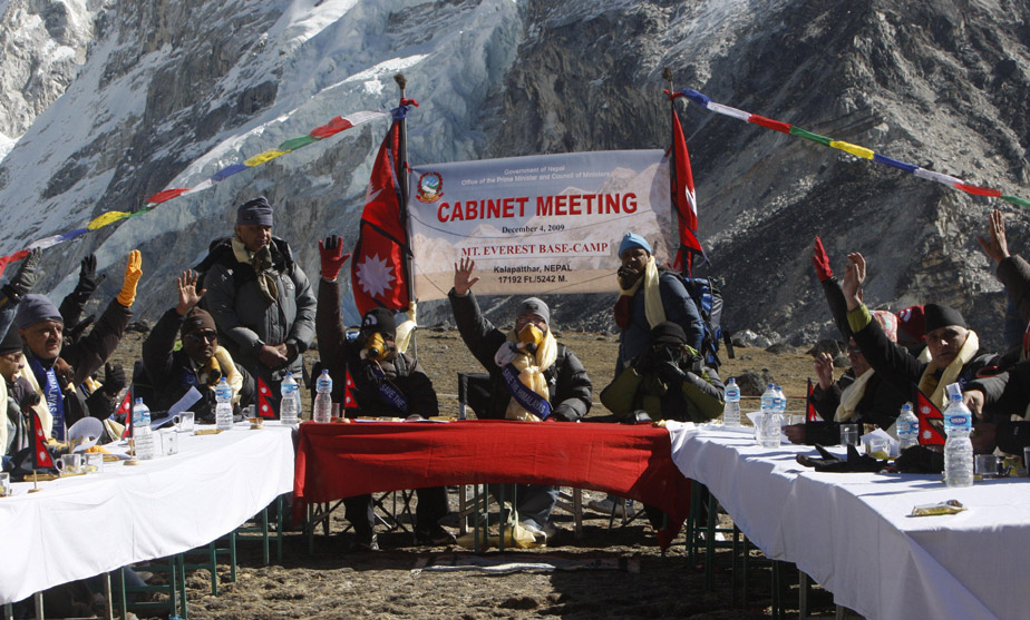 12月4日,尼泊尔总理和22位部长在喜马拉雅山海拔5262米的高度举行内阁会议,讨论全球变暖对喜马拉雅山的影响。呼吁人们切实采取行动,保护环境。