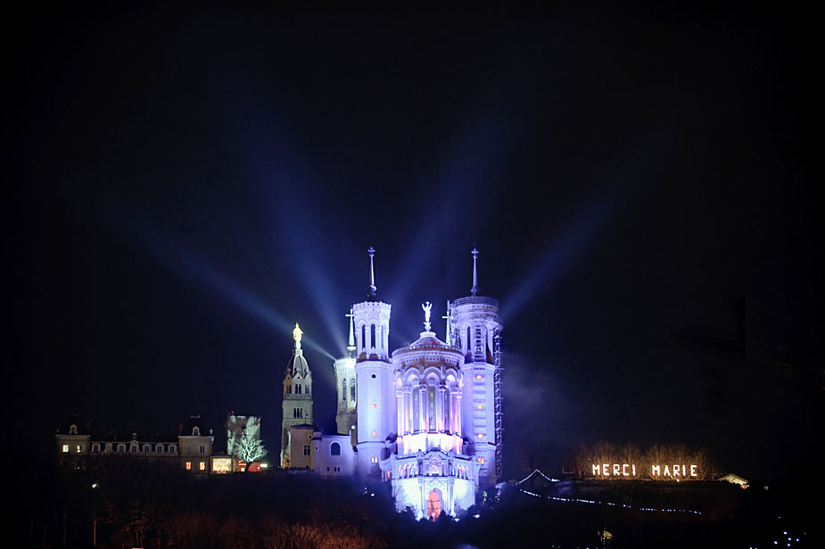12月5日,在法国里昂,人们欣赏灯光表演。第11届灯节到来之际,里昂城被五彩变幻的灯光装饰。图片来源:中国新闻网