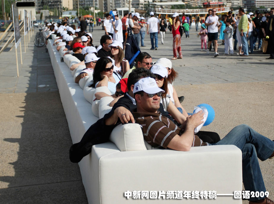 世界最长的沙发:5月9日,希腊在塞萨洛尼基展示了一个64.75米的沙发。打破吉尼斯最长沙发的纪录。图片来源:中国新闻网