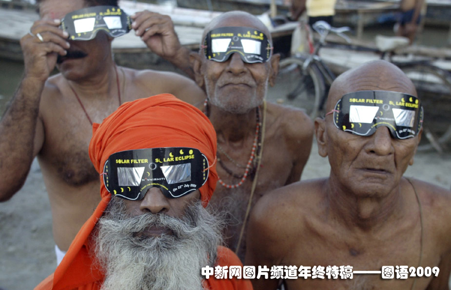 7月22日,印度教众戴着观测眼镜在户外观测日食奇观。