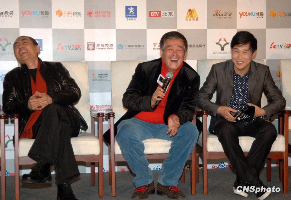 12月9日下午,张艺谋喜剧新作《三枪拍案惊奇》在京举行首映发布会,导演张艺谋、大病初愈的赵本山携孙红雷、小沈阳、闫妮、倪大洪、程野、毛毛全明星主创团队齐齐亮相。现场张艺谋、赵本山、小沈阳搞笑不断,引得爆笑连连,上演了一出戏外喜剧。赵本山首度回应了花两亿购买私人飞机一事,称还没有定下来。张艺谋表示会和“赵家班”继续深度合作,并且豪言预计未来的中国电影单部影片票房可能达到2亿美元。图为张艺谋、赵本山、小沈阳成为“笑弹”。中新社发 李学仕 摄