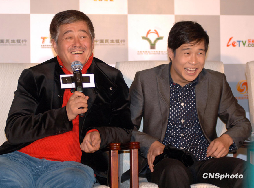12月9日下午,张艺谋喜剧新作《三枪拍案惊奇》在京举行首映发布会,导演张艺谋、大病初愈的赵本山携孙红雷、小沈阳、闫妮、倪大洪、程野、毛毛全明星主创团队齐齐亮相。现场张艺谋、赵本山、小沈阳搞笑不断,引得爆笑连连,上演了一出戏外喜剧。赵本山首度回应了花两亿购买私人飞机一事,称还没有定下来。张艺谋表示会和“赵家班”继续深度合作,并且豪言预计未来的中国电影单部影片票房可能达到2亿美元。图为张艺谋、赵本山、小沈阳成为“笑弹”。中新社发 李学仕 摄