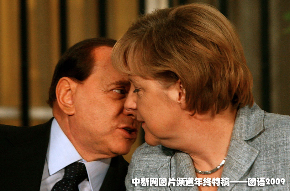 贝鲁斯科尼与默克尔亲密交谈:2009年1月18日,以色列总理奥尔默特举行记者发布会宣布停火时,意大利总理贝卢斯科尼(左)和德国总理默克尔亲密交谈。