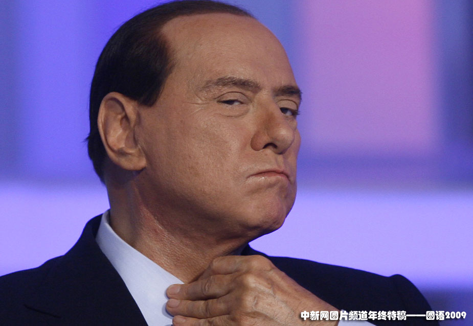 潇洒的贝鲁斯科尼:2009年9月25日,意大利总理贝鲁斯科尼在接受电视采访时整理领带。贝鲁斯科尼一直绯闻缠身,妻子也离他而去。
