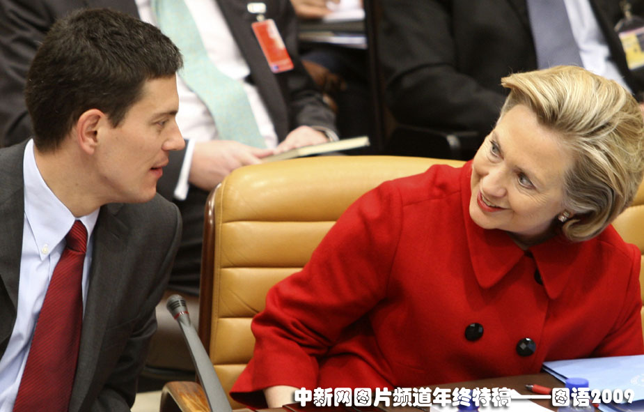 打情骂俏:2009年12月4日,布鲁塞尔北约外长会议美国国务卿希拉里与英国外交大臣米利班德两人有说有笑,关系似乎十分“暧昧”。