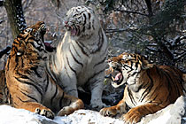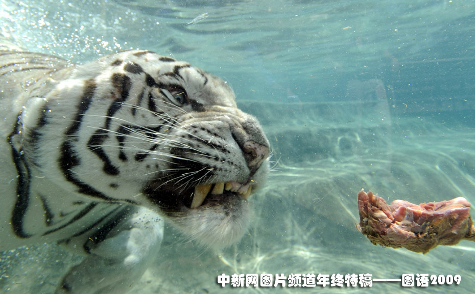 美国加利福尼亚,一只名叫奥丁的雄性孟加拉大白虎在水中“觅食”。它不仅一点也不怕水,而且出众的游泳技能闻名。