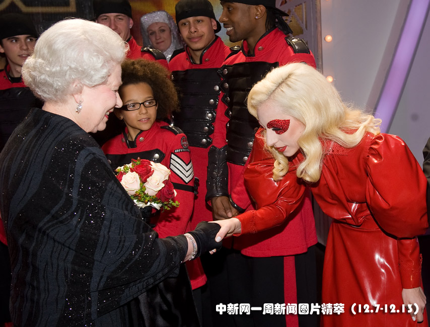 7日(周一),英国女王伊丽莎白二世,在布莱克浦歌剧院后台会见美国当红流行艺人LADY GAGA。图片来源:中国新闻网