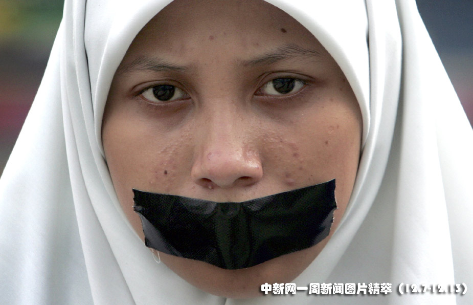 9日(周三),印尼首都雅加达,一位妇女嘴上贴着黑色胶布,参加反腐示威游行。图片来源:中国新闻网