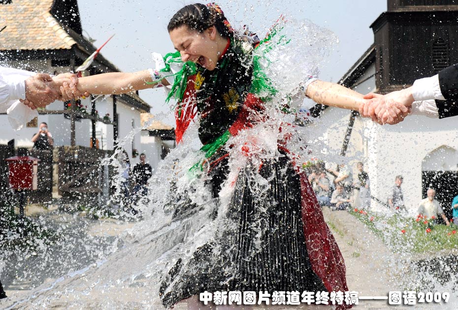 匈牙利迎接复活节“水泼美女”——4月9日,在布达佩斯东北部的一个小镇,当地居民演练了传统舞蹈和泼水活动,身着传统服装的男孩向女孩们身上尽情泼水。