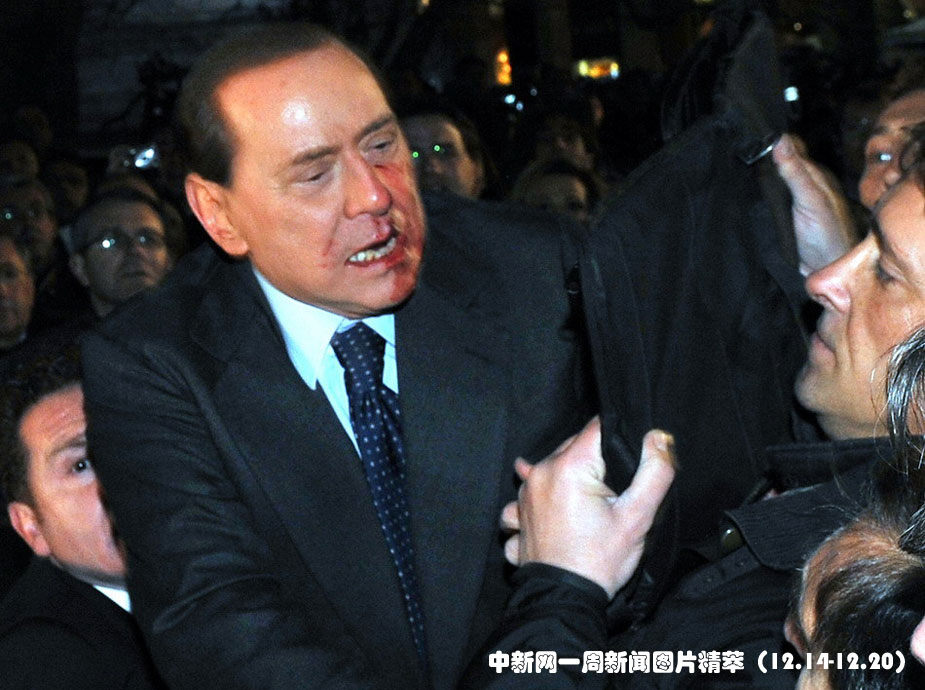 13日(周日)晚间,意大利总理贝卢斯科尼受邀在米兰参加一个集会时遭到袭击,面部受伤流血,随后被紧急送医治疗。图片来源:中国新闻网