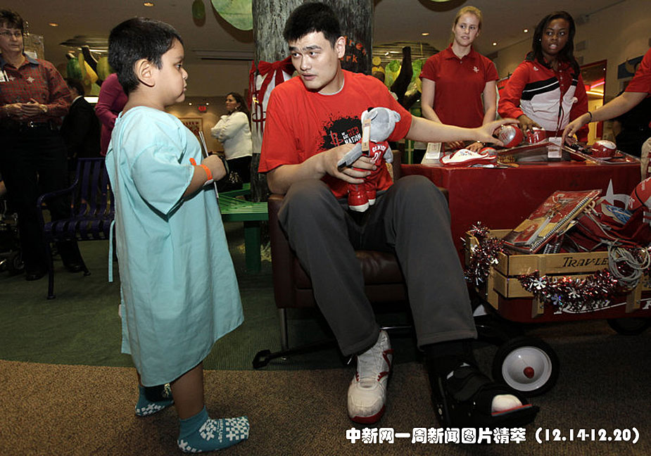 14日(周一),美国休斯敦,姚明和几位休斯敦火箭的队友来到一家儿童医院看望患儿,并为孩子们送去礼物。图片来源:中国新闻网