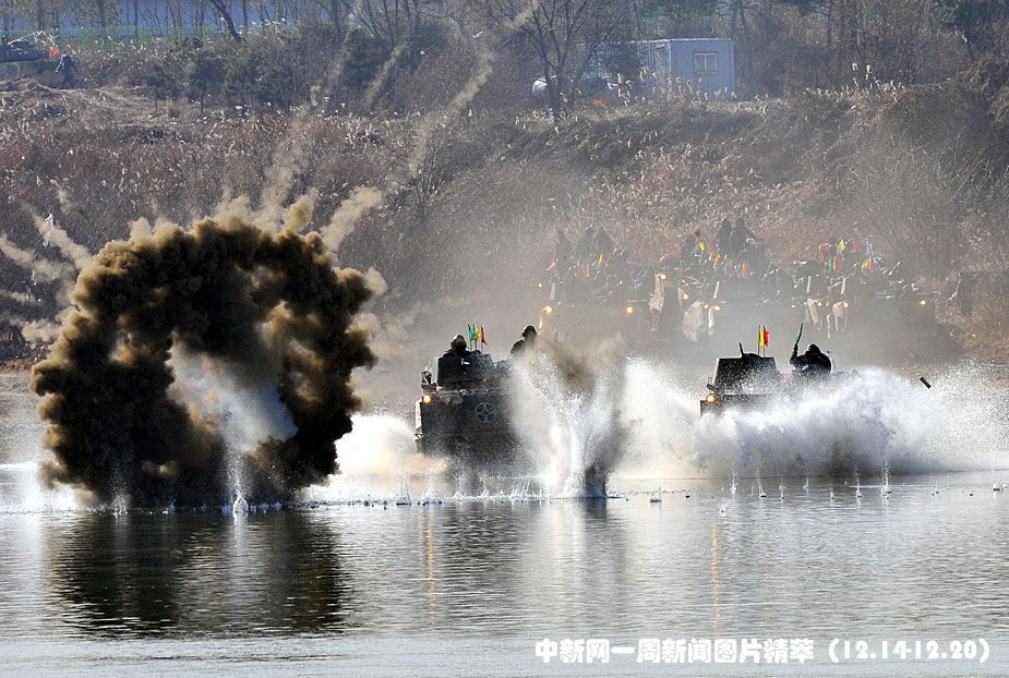 16日(周三),韩国第20师团机械化部队在京畿道骊州南汉江一带进行大规模渡河实战训练。该训练以培养战斗执行能力为重点。图片来源:中国新闻网