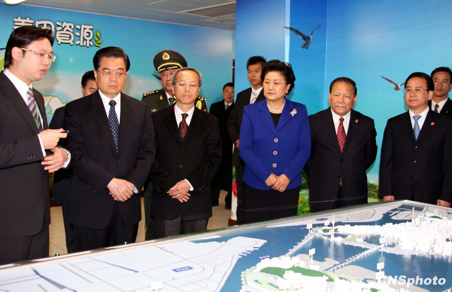 在访问澳门的紧密行程中,中国国家主席胡锦涛十九日下午来到位于氹仔北安工业区的家居弃置物处理中心。胡锦涛听取了澳门环保基建设施沙盘及展示板介绍并参观了控制室。中新社发 张朔 摄