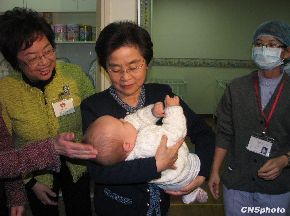 12月19日下午,国家主席胡锦涛的夫人刘永清参观澳门母亲会托儿所时,抱起一名不足一岁的婴儿。中新社发 于晶波 摄