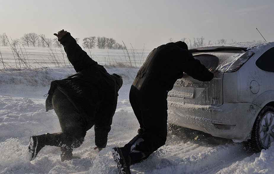 图为12月20日,匈牙利首都布达佩斯西部的公路上,人们正从积雪中将抛锚的汽车推出。