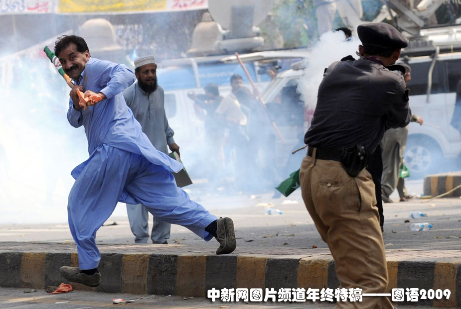 2009年3月15日,巴基斯坦前总理谢里夫的支持者在拉合尔举行抗议集会时与警察发生冲突。