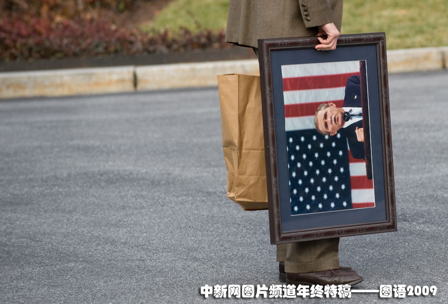 2009年1月17日,一位美国白宫职员在白宫外手持上一任总统小布什的照片。一周前美国新任总统奥巴马宣誓就职。