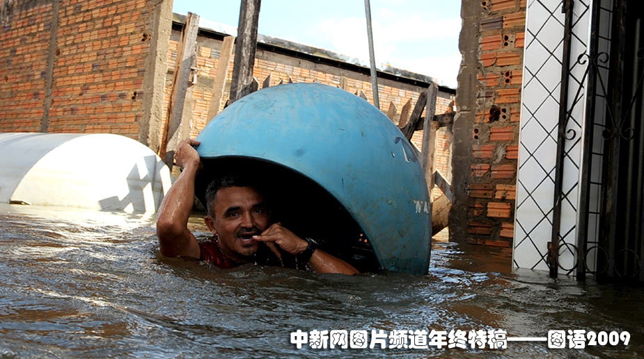 2009年5月11日,一位巴西民众在洪水中模仿打电话求救的样子。