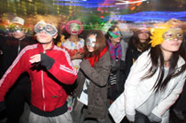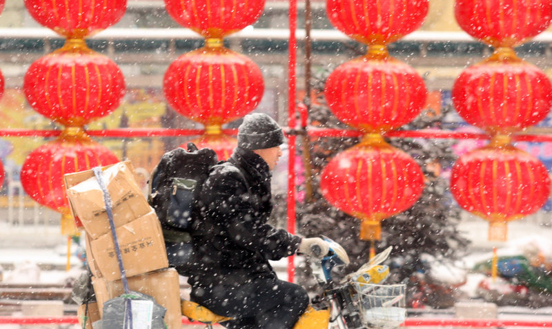 12月25日,受寒潮影响,哈尔滨大雪纷飞。图为道里区经纬街上,市民们从红灯笼旁经过。苏强摄