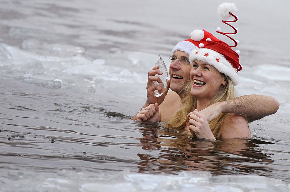 12月25日,德国柏林的冬泳俱乐部“柏林海豹”(Berliner Seehunde)的成员不畏寒冬,光着身子在已经结冰的Oranke湖中畅游一番。图片来源:中国新闻网