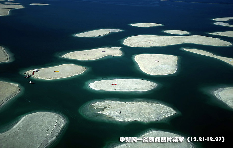 21日(周一)拍摄的这张鸟瞰图展示出迪拜海岸边名为“世界”的人造岛群。