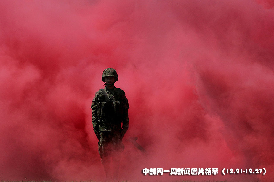 23日(周三),在哥伦比亚西部城市卡利,一名参加军事庆典的士兵被信号弹散发的红色烟雾包围。