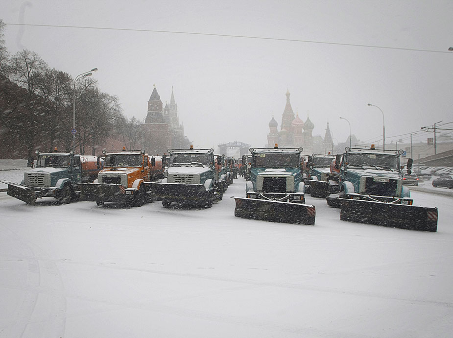 图为12月29日,俄罗斯莫斯科红场上除雪车在进行除雪作业。