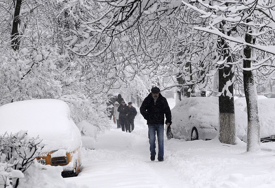 图为12月29日,乌克兰首都基辅人们行走在满是积雪的街道上。