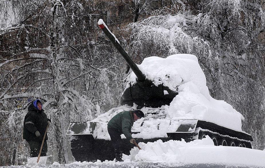图为12月29日,乌克兰首都基辅的二战纪念碑前,工作人员正在除雪。