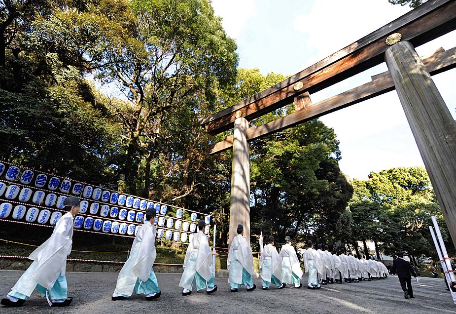 图为12月31日,日本东京僧人走在去祭祀的路上。每年日本都要在新年来临之际举行祈福仪式。