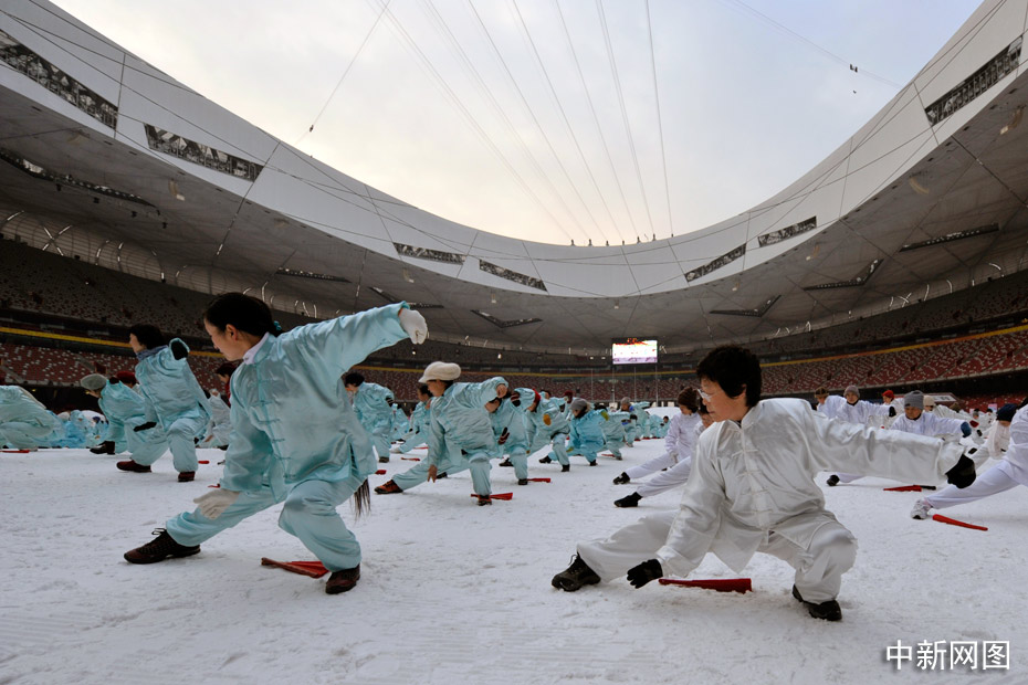 2010年1月1日上午,2010人在被冰雪覆盖的鸟巢内表演了太极拳、武功扇等民族传统健身项目。中新网记者 金硕 摄