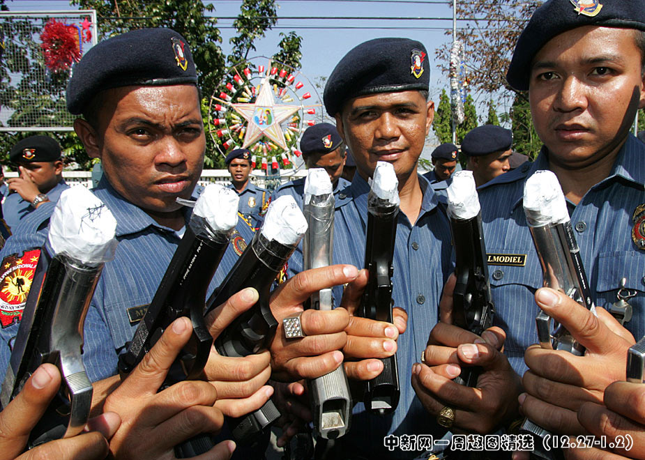 12月29日,菲律宾首都南部的塔吉格市警察部队为了防止警务人员在庆祝新年时胡乱开枪,下令用胶纸把枪口封起来。图片来源:中国新闻网>>点击观看详细内容