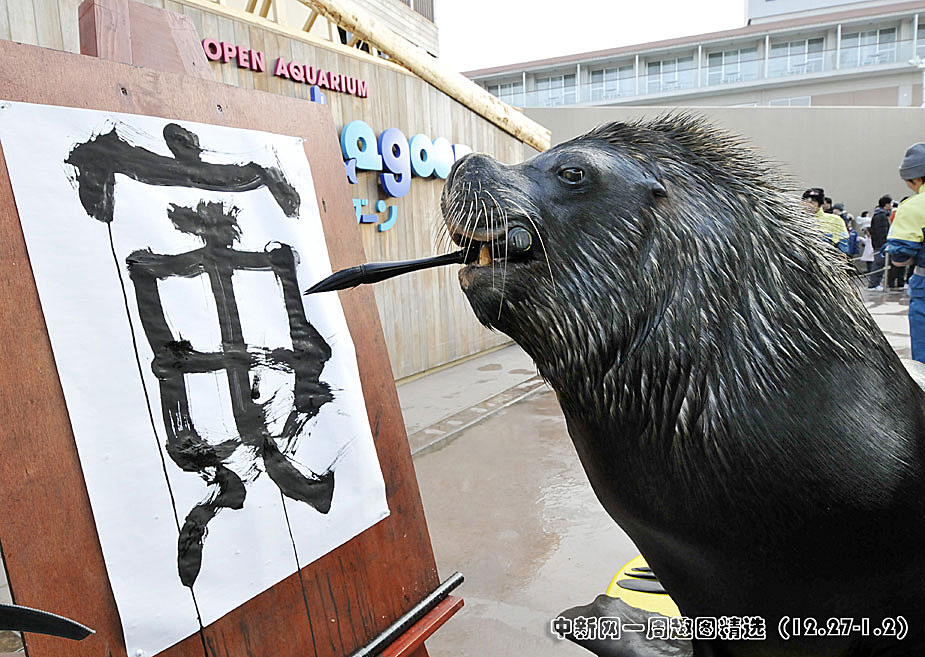12月30日,日本神奈川八景岛海洋乐园水族馆内,海狮表演了用毛笔在纸上“写”汉字的节目。图片来源:中国新闻网>>点击观看详细内容