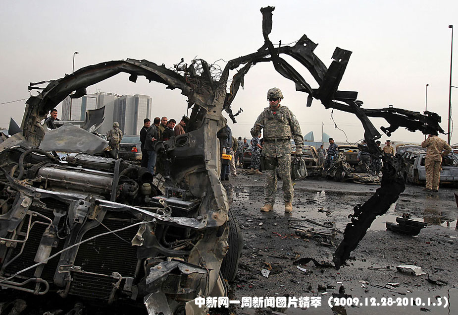 周二(29日),巴格达东部的政府办公地发生爆炸事件,驻阿美军士兵正在检查案发地。图片来源:中国新闻网