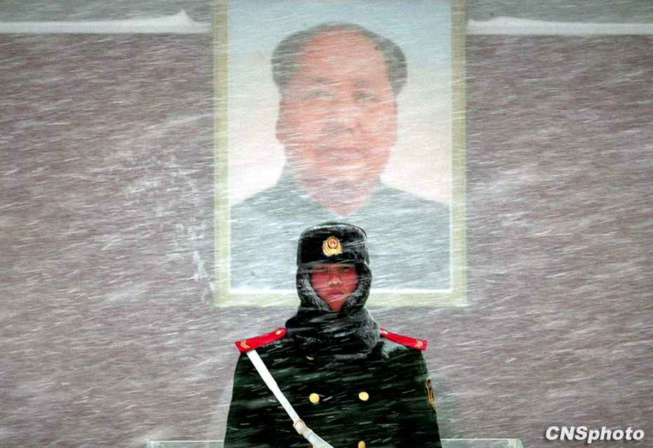 1月3日,一场大雪将华北地区再度披上厚厚的银装。图为天安门武警在大雪中坚守岗位。 中新社发 张郎 摄