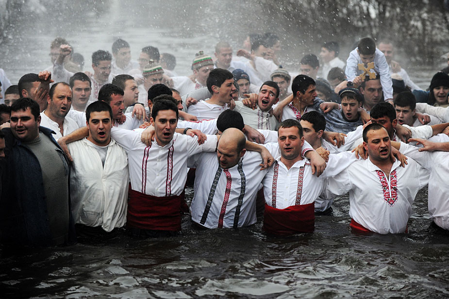 1月6日,在保加利亚卡洛菲尔市,人们在冰冷的河水中跳起保加利亚民间舞蹈霍洛舞,相互祝福在新的一年里身体健康,事事顺遂。图片来源:中国新闻网