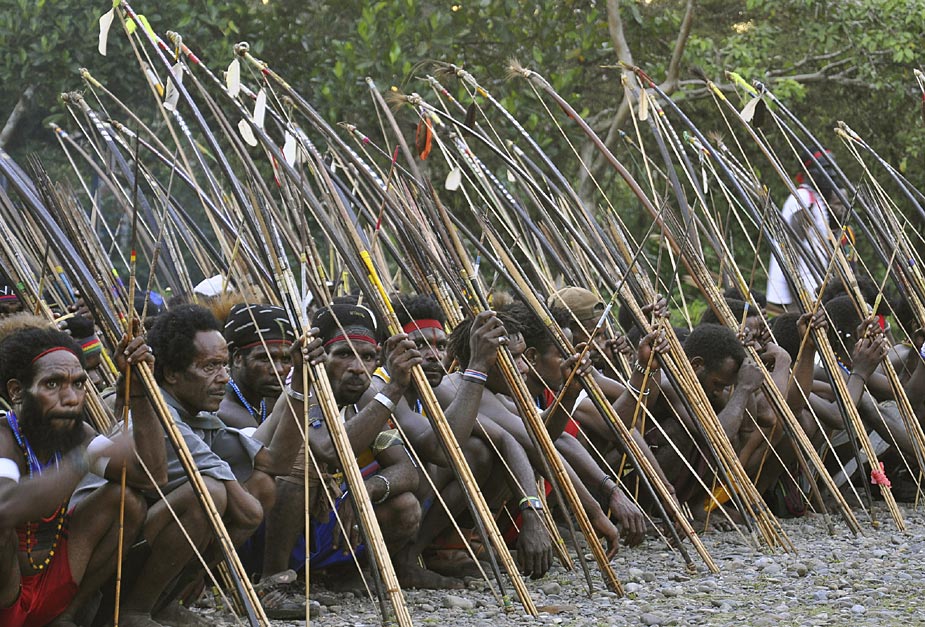 1月6日,印尼巴布省的两个村落因债务问题引发了武装争斗,双方手持弓箭等原始武器进行了一场原始的战争。目前,这场冲突已经造成多人伤亡。图片来源:中国新闻网