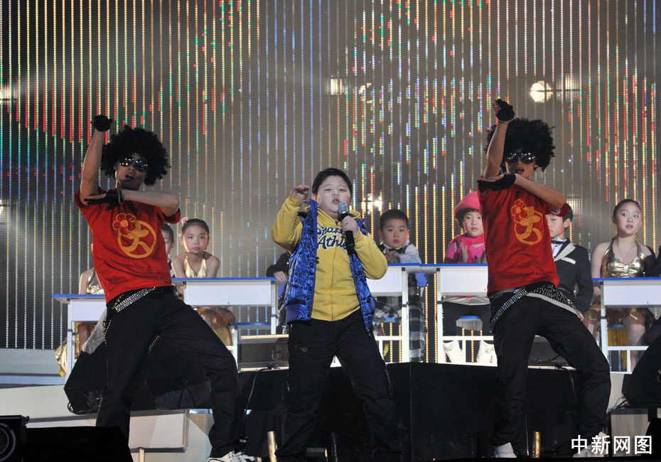 1月11日晚,第二届音乐风云榜新人盛典在京举行,盛典现场的音乐课上,儿童版的Wonder Girl、Super Junior、迈克尔·杰克逊、曾轶可、大张伟纷纷登台献艺,让现场观众们笑声不断。中新网记者 金硕 摄