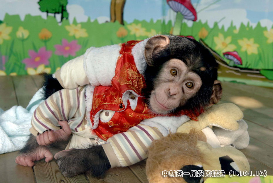 1月12日,冷空气持续来袭,广州香江野生动物世界特意为精灵可爱的黑猩猩四毛量身定做了一件唐装棉袄度过冬天。图片来源:中国新闻网>>点击观看详细内容