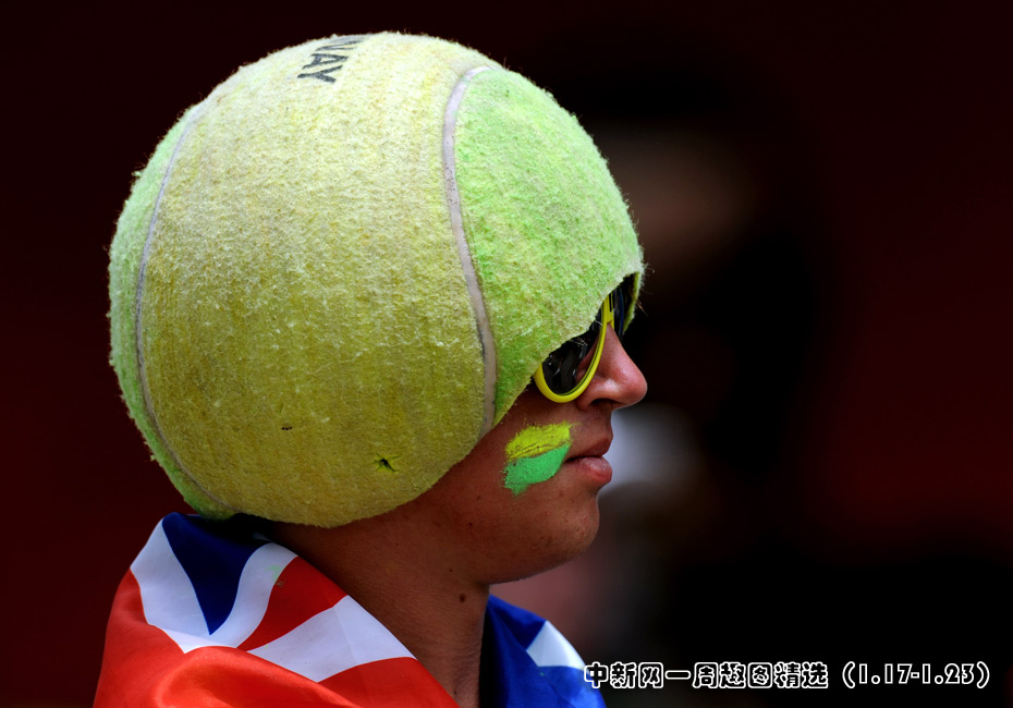 1月21日,澳大利亚墨尔本网球公开赛的第四天,一个头戴巨型网球帽的观众在看台上显得格外特别。图片来源:中国新闻网