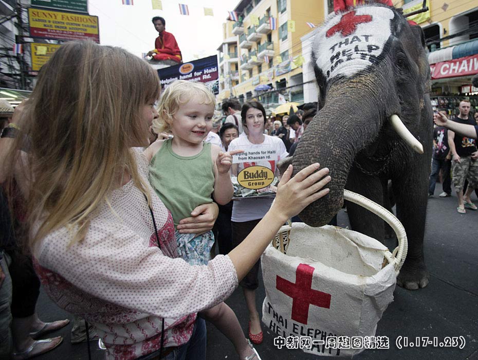 1月21日,在泰国首都曼谷举办了一场大象为海地灾区募捐活动。人们纷纷向大象携带的篮子内放入善款,向海地地震幸存者献上一份爱心。图片来源:中国新闻网>>点击观看详细内容